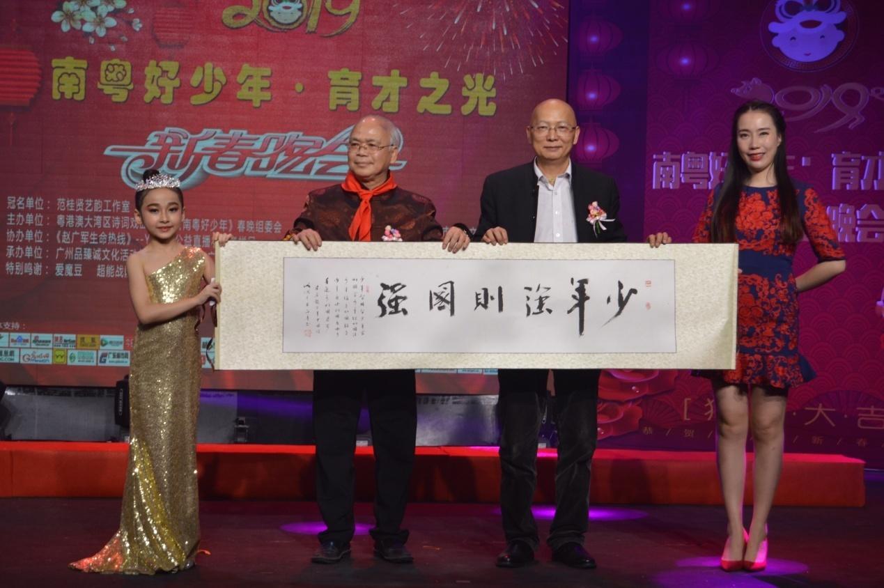 烟花的一瞬间是快乐;流星的一瞬间是祝愿;每年的少儿春晚是检验孩子们一年勤奋努力的展示平台,“南粤好少年”在青葱岁月中快乐成长,今天我们又迎来了充满希望与激情的2019“南粤好少年·育才之光”少儿迎春晚会,向南粤大地的朋友们献上我们真诚的祝福;此次晚会得到了着力音乐文学创作·推动原创音乐发展的著名词作家范桂贤老师的大力支持,将他原创作词的《育才之光》做为本次晚会的主题曲,最新创作的贺年歌曲《狮舞太平年》献给本次晚会开场舞曲,为本次晚会增色不少。